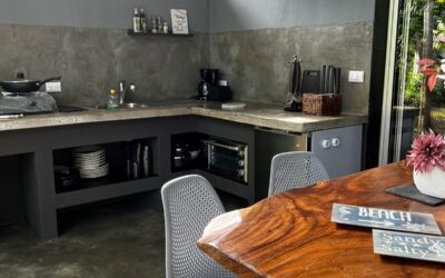 bestehend aus einem Wohn/Schlafzimmer, Küche, Terrasse, Aussendusche, Feuerstelle