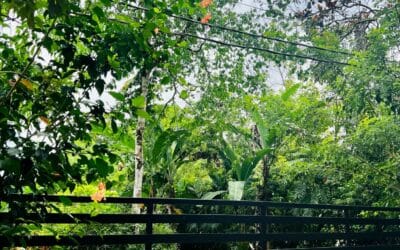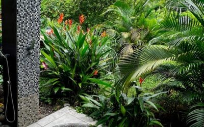 Tropischer Garten mit Palmen und vielen Fruchtbäumen.